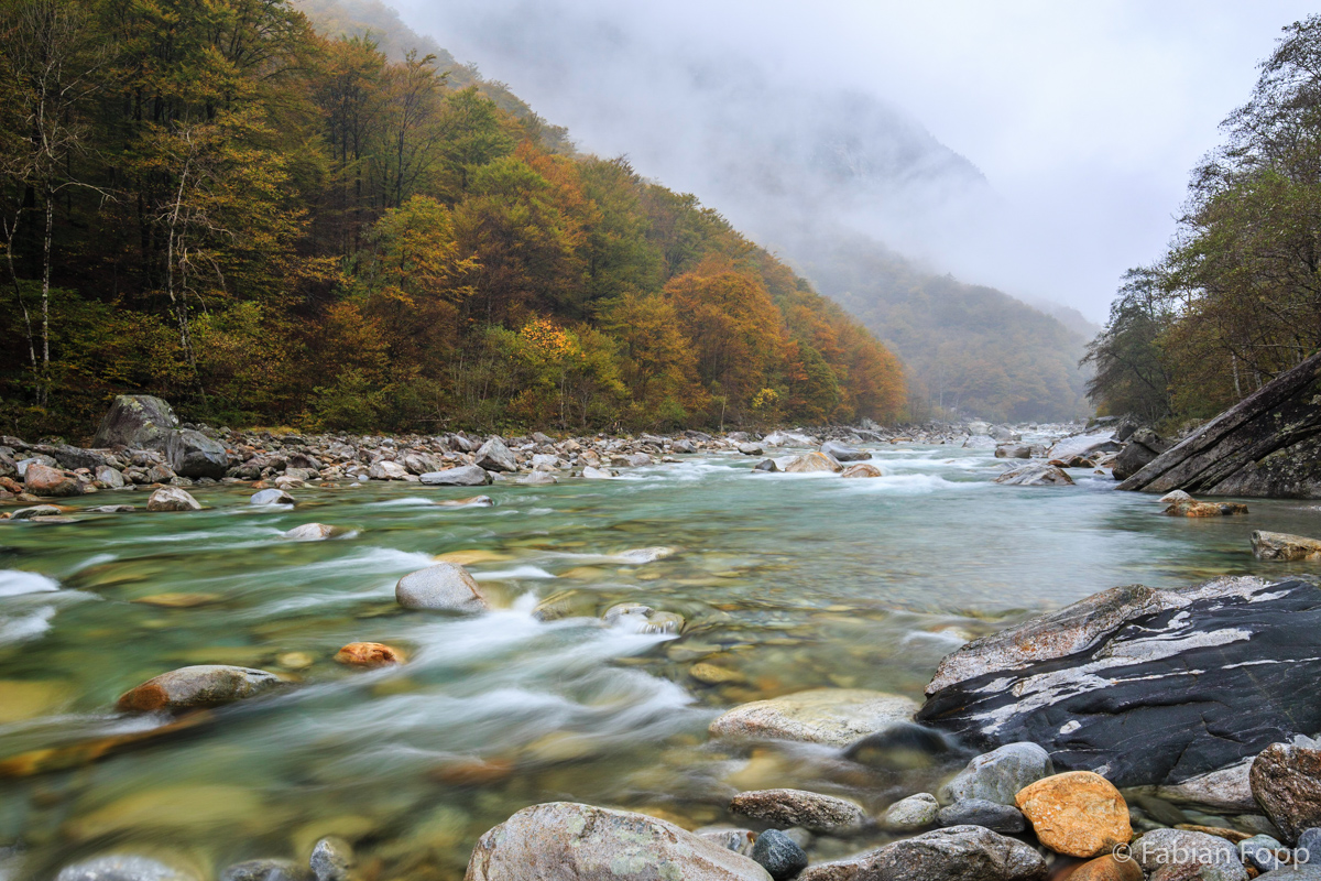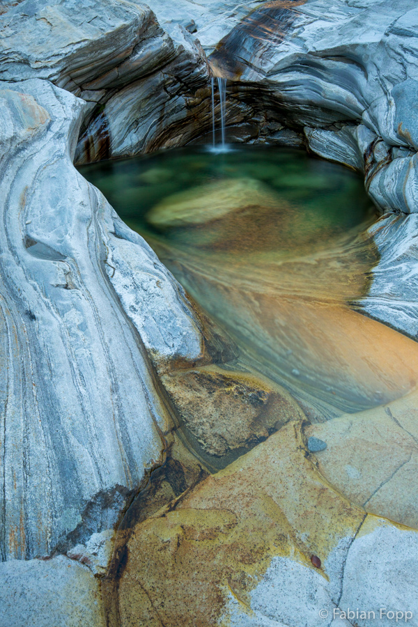 Diesen Herbst wollte ich wieder einmal ein paar Landschaftsbilder machen, weshalb ich im Oktober und November zwei Tage an einem schönen Bergbach im nahegelegenen Tessin verbrachte. Neben den „klassischen“ Bachaufnahmen gibt es dort unglaublich viele Möglichkeiten, um interessante Steinformationen und Details zu fotografieren, so dass einem nicht so schnell langweilig wird… Das Wasser ist an vielen Stellen richtig grün und glasklar, was fast schon surrealistisch wirkt. Wenn man dann noch an einem Tag fotografieren geht, an dem die Steine nass sind, dann sind die Farben besonders intensiv.