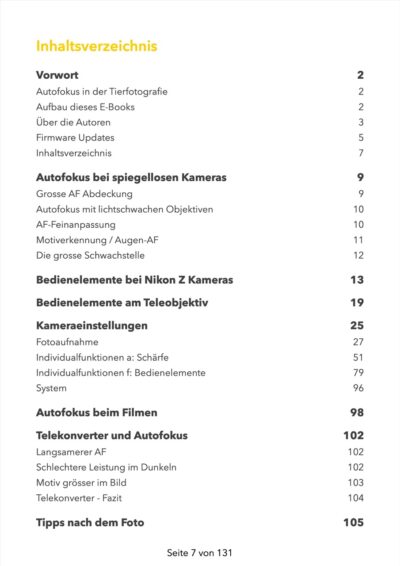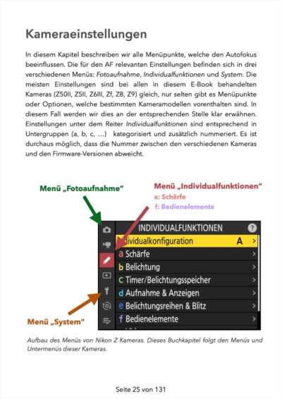 Bleibe Up to Date:  Mit neuen Kameras oder sogar durch Firmware-Updates können neue Funktionen hinzugefügt werden oder bestehende abgeändert werden. Im Juni 2025 hat Nikon zum Beispiel einen flexiblen Fokusbegrenzer ins Menü der Z8 integriert. Bei relevanten Änderungen werden wir unser bestes geben, dass E-Book zeitnah zu aktualisieren. Wenn du es heute kaufst, sind diese Updates des E-Books bis mindestens Ende 2026 kostenlos.