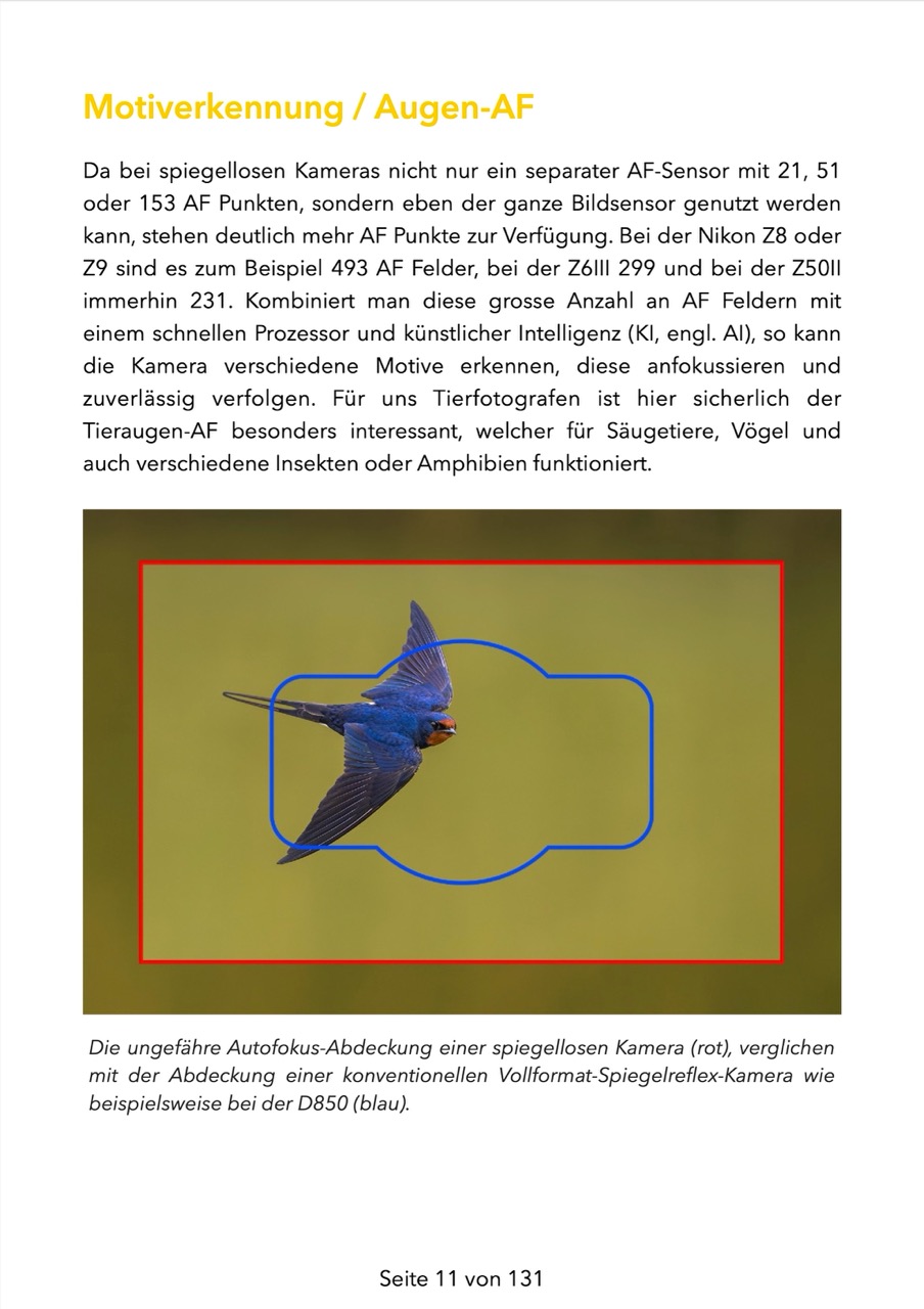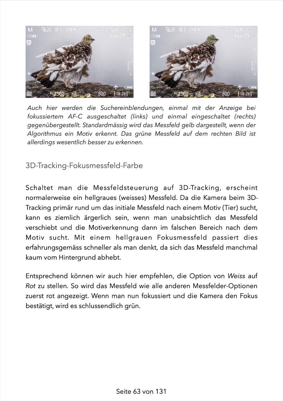 Dann ist dieses E-Book genau für dich gemacht. Du profitierst von den Erfahrungen und Tipps zweier Tierfotografen: Nicolas Stettler und Fabian Fopp. Wir erklären dir alle Autofokus-Einstellungen, geben Ideen und Anreize zur Konfiguration der Tasten und zeigen dir, wie du Aufnahme- und Individualkonfigurationen speichern und schnell wieder aufrufen kannst.
