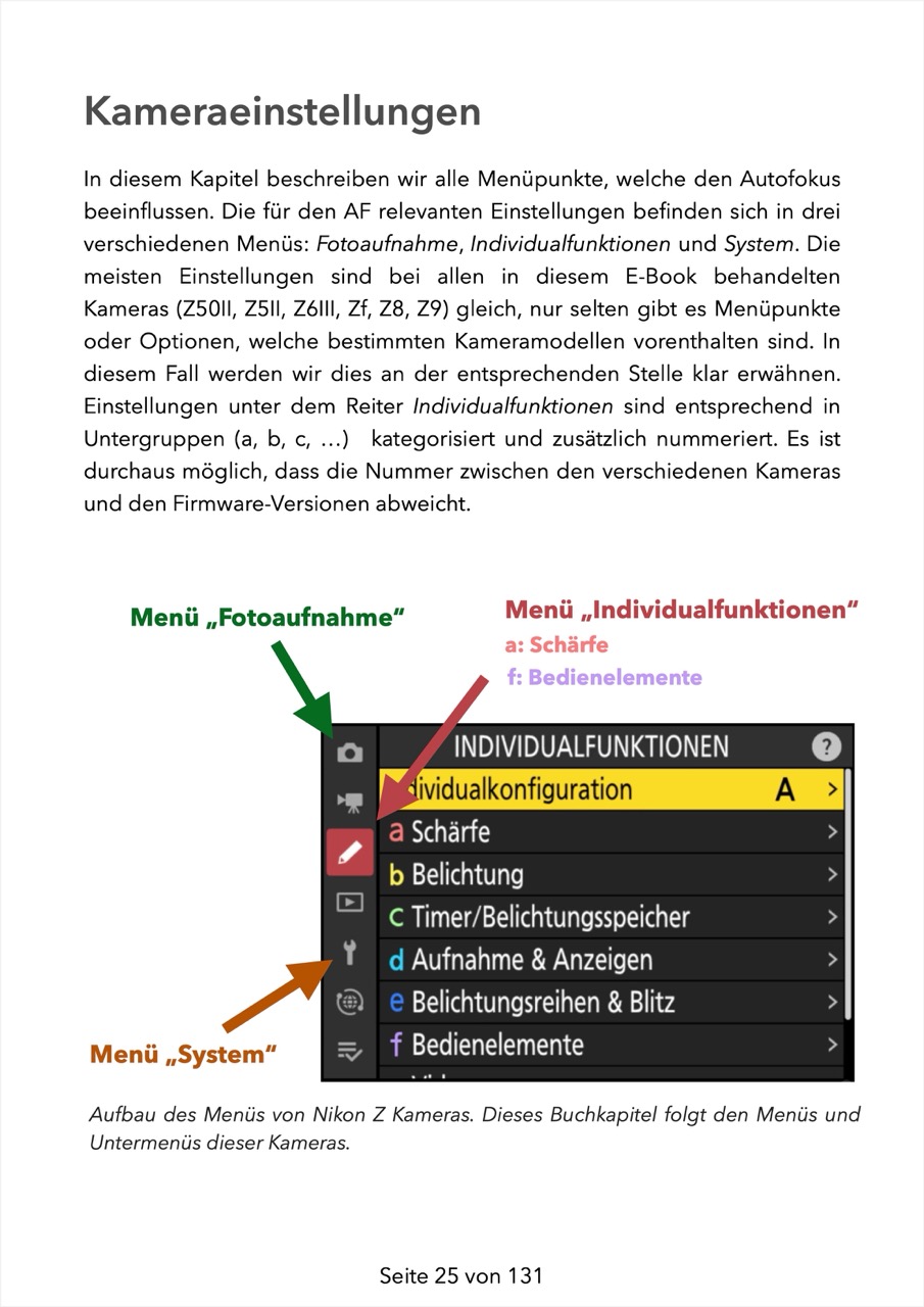 Bleibe Up to Date:  Mit neuen Kameras oder sogar durch Firmware-Updates können neue Funktionen hinzugefügt werden oder bestehende abgeändert werden. Im Juni 2025 hat Nikon zum Beispiel einen flexiblen Fokusbegrenzer ins Menü der Z8 integriert. Bei relevanten Änderungen werden wir unser bestes geben, dass E-Book zeitnah zu aktualisieren. Wenn du es heute kaufst, sind diese Updates des E-Books bis mindestens Ende 2026 kostenlos.
