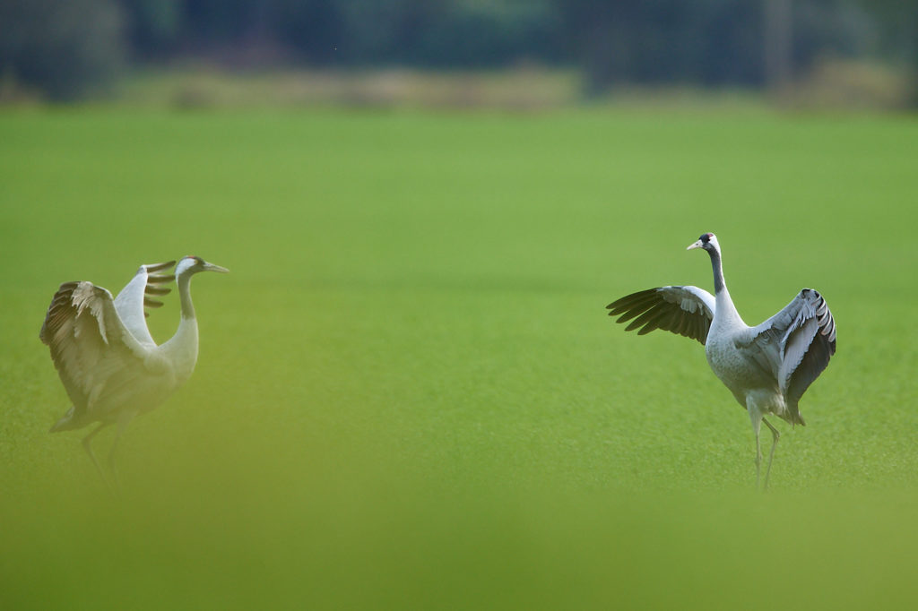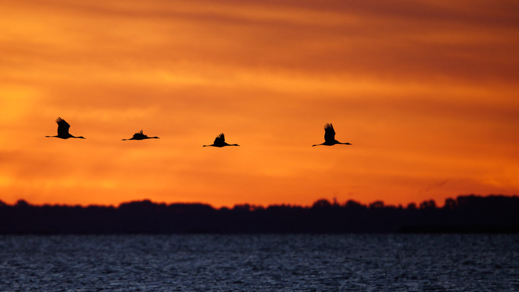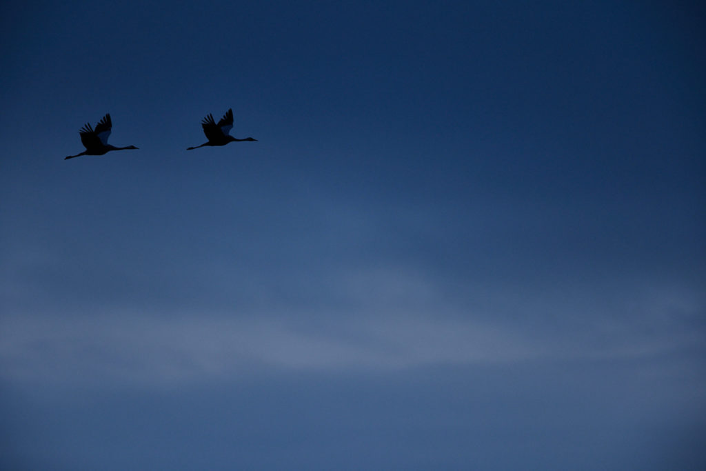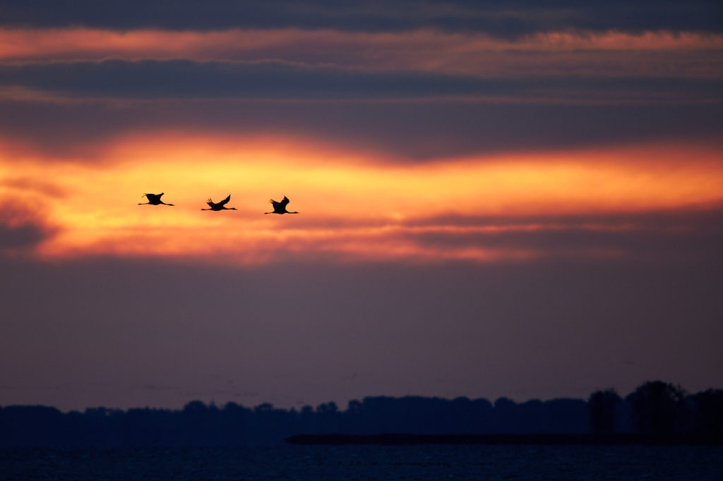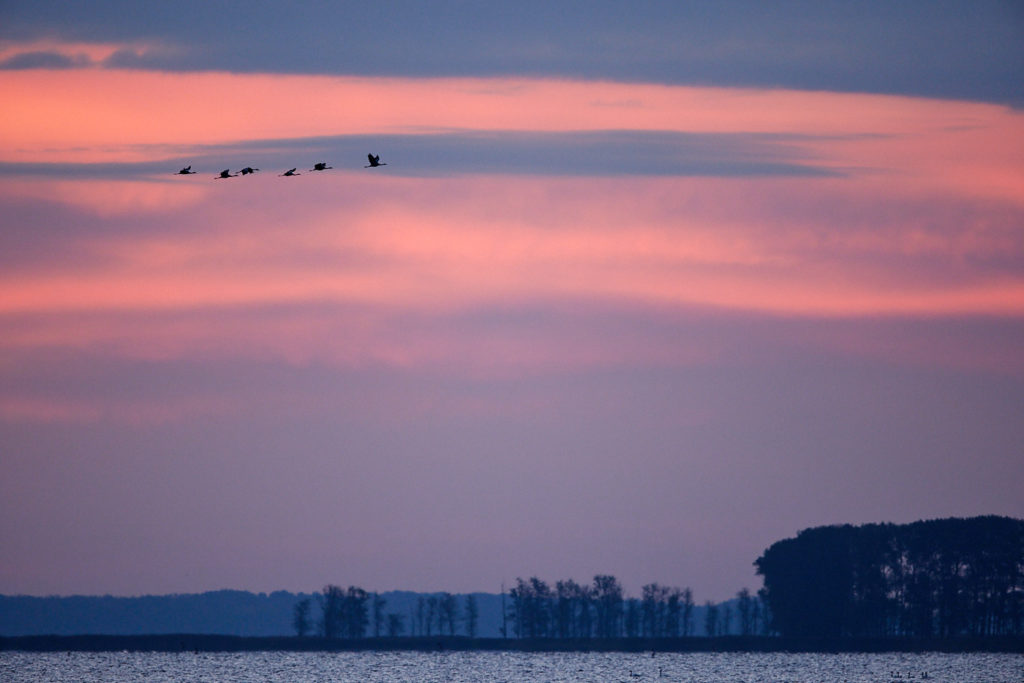 Bereits am ersten morgen konnten wir die Kraniche über der charakteristischen Landschaft des Darß bewundern. Die Farben knallten richtig und die Stimmung grenzte schon etwas an Kitsch. Doch wie so häufig zahlte es sich aus, mehrmals am Morgen früh aufzustehen und auf Fototour zu gehen. Zwar zeigten sich die Kraniche an diesen Orten sehr zuverlässig, doch erwarteten uns verschiedene Lichtstimmungen und so brachten wir auch jeweils ganz unterschiedliche Bilder nach Hause.