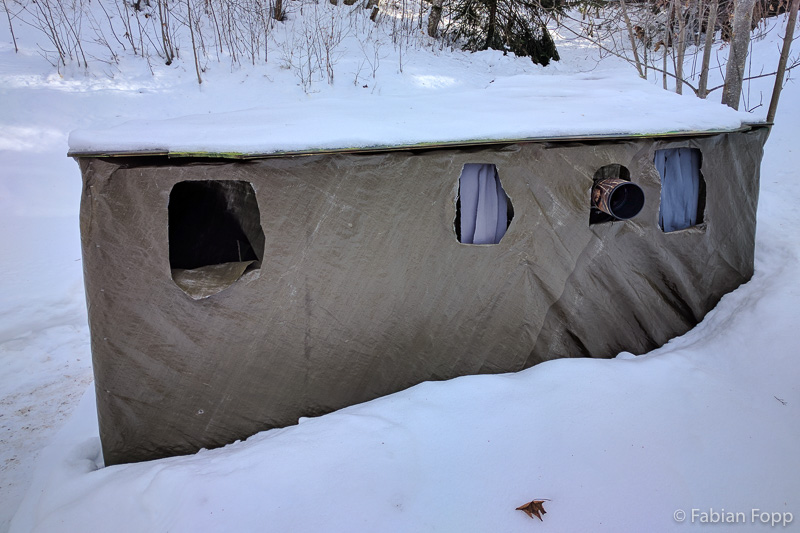Diesen Winter habe ich im Garten eine Winterfütterung für Singvögel eingerichtet. Um die Vögel möglichst wenig zu stören und von ihnen nicht entdeckt zu werden, habe ich ein Tarnversteck gebaut. Es hat zwar einige Tage in Anspruch genommen, aber ich denke es hat sich gelohnt! Ohne Schnee würde sich das Hide zwar etwas besser in die Landschaft einfügen, aber es tut auch so seinen Zweck.